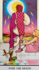 The tarot, as well almost every other philosophy, teaches that nothing is static. What goes down must also come up. (Physics says that what goes up must come down, though it doesn’t say anything about things that are already down.) The moon card certainly seems fitting today because (at least from a human perspective), the moon goes down, but inevitably, as the world turns, it will come up again. (That’s not to say that one day the earth will stand still; to the best of my knowledge, that has only happened once or twice — according to legend — and eons before my lifetime.)