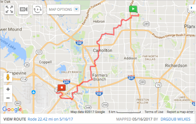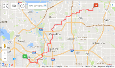My ride home was solo. I had to leave the office earlier than Jeff to make a dinner appointment. I was able to retrace my tracks by memory. (My cycling friends would be surprised that is possible, since I tend to get lost on trips I lead with them.) Traffic did not get bad until the last legs in Plano. Only one jerk needed to let me know I was not welcome on his street.