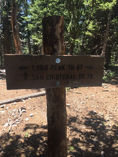 The trail follows the San Cristobal Creek and is shaded most of the way. We counted about eighteen (18) creek crossings. We easily managed most of them, but we had to build up one to get to the other side. Less snow fall and later weeks of summer will lessen the flow of the creek and the number of crossings.The 3,100 feet of elevation gain over the four miles to the intersection of Lobo Peak Trail #57