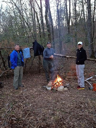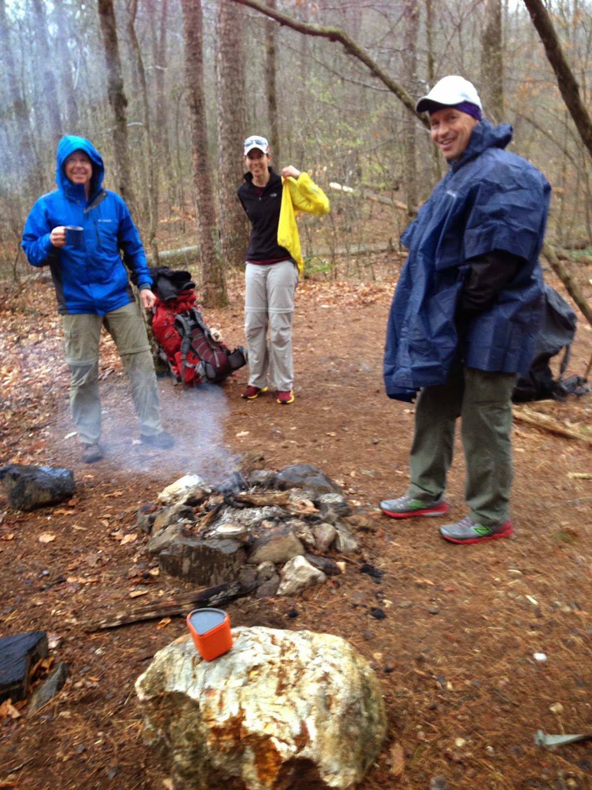 Jon, Jim and AmyWe parked at the Winding Stairs parking lot and headed counterclockwise on the Loop. We started about 5:30 p.m. and hiked a couple of hours before we set up camp along the trail next to the river. Although it was April, the temperature dropped into the high 30s that evening. This made conditions perfect for an open fire and sleeping bags.Our imagination had us deep in the forest away from any forms of civilization. However, about 9:00 p.m. a truck drove down a road on the other side of the river with its high beams on. Oh well, at least we were not far from help if we needed it. (About 2:00 a.m. ATVs buzzed through to wake some of us. Danged motorized outdoor vehicles.)