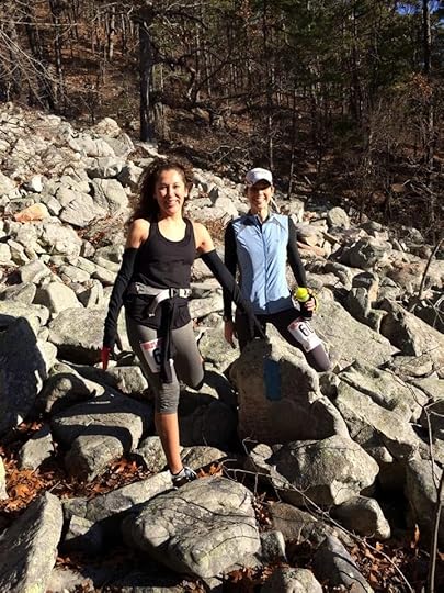 Ginger and Amy on rock slideWe ran along a river and crossed several streams that required only one or two steps on rocks to get across. One crossing, however, demanded we wade through the water. It was shin-high and winter-cold, but the temperature helped swelling feet to feel great--both out and back!