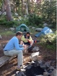 We set up camp, recon'd the lake, chatted on the shore, gathered wood, cooked our freeze-dried dinner, built a fire, assembled s'mores, and crashed in our tents by 10 p.m. Mountain goats, squirrels, a rabbit, and chipmunks invaded our site looking for handouts, which we refused to give them. Their presence added to the wildness of the setting. The night was cold and as clear as the lake during the day.