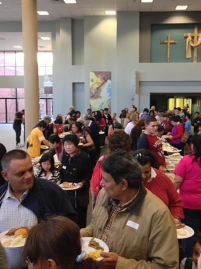 After this I looked, and there before me was a great multitude that no one could count, from every nation, tribe, people and language, standing before the throne and in front of the Lamb. They were wearing white robes and were holding palm branches in their hands. And they cried out in a loud voice:“Salvation belongs to our God, who sits on the throne, and to the Lamb.” (Rev. 7:9, 10)Thanksgiving is not Thanksgiving for me until I participate in this gathering of the nations. The life stories and diversity of backgrounds remind me of the height, depth, and breath, of God's love.