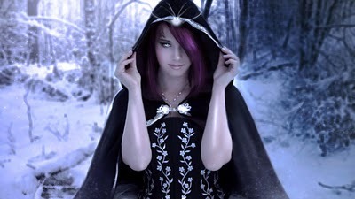 Here's a lovely picture of a winter queen. Methinks there's something magical about the wintry forest behind her. I love her cloak. And dress. I would so buy that outfit.