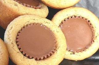 Make the peanut butter cookies as directed on the back of the Betty Crocker bag. Roll the peanut butter cookie mixture into balls. Roll the balls into the sugar. Cook the balls as directed. Before removing the cookies from the oven, add a peanut butter cup in the middle of each cookie.