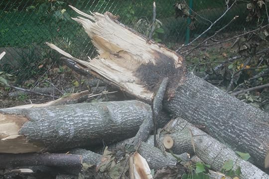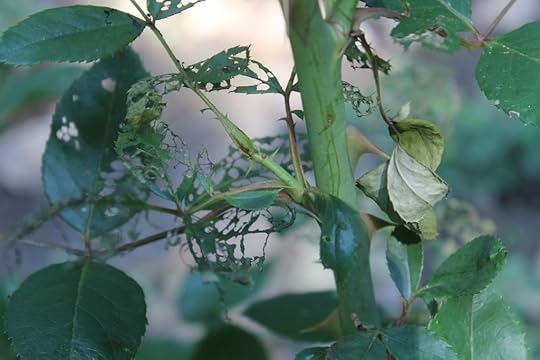 Up to the rose garden which survived the storm mostly unscathed. Pretty, right? Then I see the leaves!