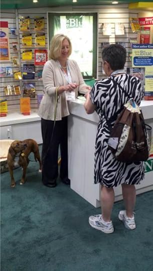 “Little Boy Blue” author Kim Kavin and her dog, Blue, spent several hours signing advance copies of the book yesterday at the Barron’s booth at Book Expo America. It was Blue’s first-ever trip to New York City (or any major city, for that matter), his first time in a huge parking garage, his first time walking across a road with more than two lanes, his first time walking past food carts on the street, his first time going into a convention center, and his first time being exposed to hundreds upon hundreds of strangers who lined up to pet him and meet the author.