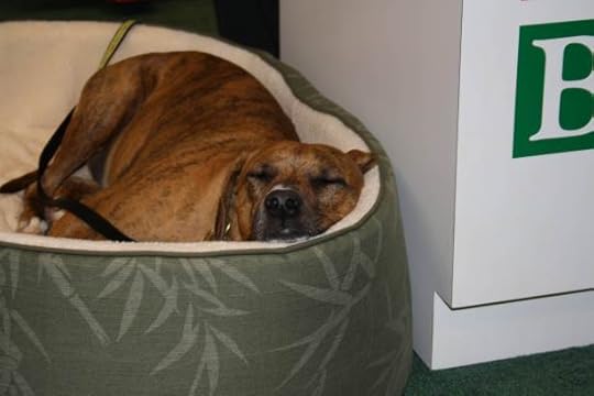 At the end of the afternoon, Kim had signed more than 900 advance copies of “Little Boy Blue” and about a thousand people had pet Blue, taken photos with him, and taught him how wonderful most human beings are compared with the ones who left him for dead in a gas-chamber shelter two years ago. Blue especially liked the three-year-old boy in line who tried to share his lollipop, as well as the woman in the motorized wheelchair who gave him a treat and taught him that people in moving chairs are not scary, but instead very nice.