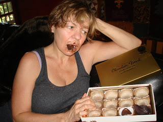 Work-out: Sometimes I want some chocolate, dammit. Sometimes I want to sit on my ass and do nothing but eat that chocolate and feel depressed and not do a danged ole thing. Some days feel sucky. I don't know if I could ever run a maratttthooonnnn. I'm tired of not eating what I waaaant toooooo. How come she looks so good and young and dewy and she doesn't hardly do a thing and I work my ass off to stay in shhaaaaape (though maybe she is working her ass off, how do I know, huhn). But when I sit on my ass and gobble down an entire box of chocolates, feeling sorry for myself and the state of Everything, what happens is I feel even worse than before. My body is bloated and sick from Chocolate Overload.