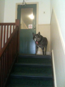 She hesitates going down the stairs but she did that before the surgery, too.