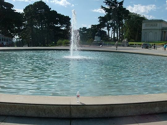 We stopped at Lincoln Park to admire the view across the strait to the Marin Headlands. It's a lovely site, featuring a moving Holocaust memorial. The park is also home to the California Legion of Honor, a fine arts museum. Outside the museum is a lovely reflecting pool. And someone had chosen the pool as a good place to leave a bottle of water. Why so people give themselves permission to do this, I ask myself, when bins are so close.