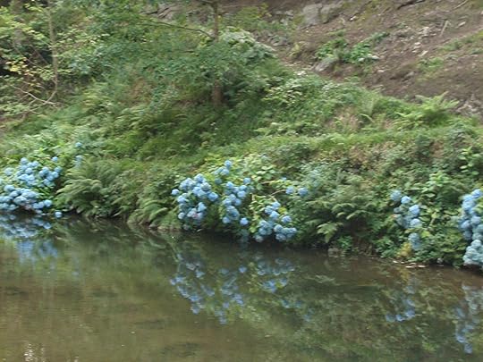 Hydrangeas reflected in the River Hiraethlyn look like a Monet painting.