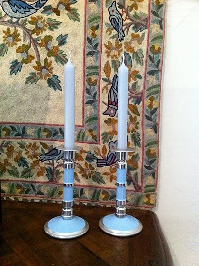 I don't know what these beautiful candle sticks are made from, some kind of enamel possibly, but I fell in love with them and was happy to pay $16 for the pair. Practical as well as pretty—we often lose power when storms rage through our valley and it's reassuring to have candles to hand when it suddenly goes dark.