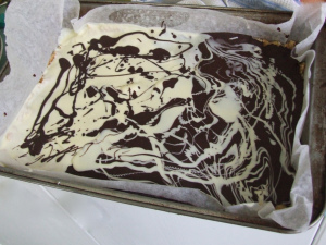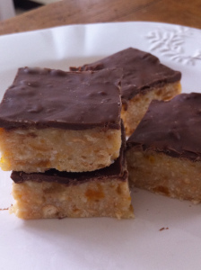 “The Slice ” is correctly called Apricot and Coconut Slice and I originally found it on a Nestle ad in a magazine. It’s a decadent concoction made with crushed sweet biscuits (of the Australian and British type of biscuit), finely cut dried apricots, dessicated coconut, condensed milk and chocolate. (In Australia a Morning Coffee biscuit works brilliantly, in Britain a digestive, in the US, I think a graham cracker would substitute.)