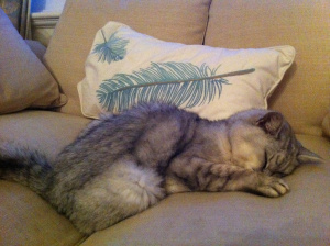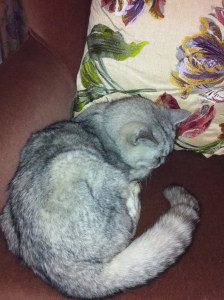 My darling Albert looked so content and happy when I took this snap of him on the sofa. In a deep sleep, his head was tucked on his paw, ears and paws occasionally twitching. Memories of long ago mouse hunts? Meals? Who knows? His waking time revolves around wailing for food, nibbling at food, turning his nose up at food that he deems unsatisfactory, sometimes needing to be fed by hand (and I mean literally from the palm of our hands) and snuggling with his humans at any opportunity. Always a sociable cat, he totters down the hallway to greet visitors, still wanting to know what’s going on, still wanting them to make a fuss of him. So maybe he’s dreaming about food and parties!