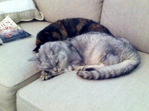 It isn’t just us who looks after him. Our younger cat Tabitha–well, relatively young at age 12!–looks after him too, grooming him and letting him eat first. So sweet to see them together.