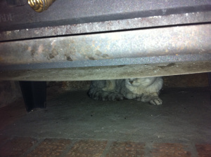 As the weather cools Down Under, Albert needs to keep his frail bones warm and loves nothing better than baking under the wood combustion heater. It gets hot under there and he eventually comes out for fresh air and a drink. He’s done it for years–so do the others–and it doesn’t seem to harm him though the vet is horrified to hear it.