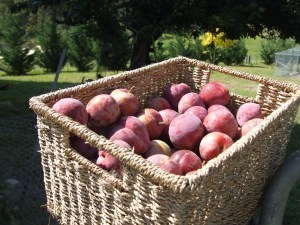 One of the very special things about an old house is the garden that comes with it. Our farmhouse is graced with wonderful fruit trees—some of them more than fifty years old, our neighbors tell us. The star is a gnarled old plum tree that each year bears an abundance of superb plums—more than enough for us and for the flocks of birds that also appreciate its fruit. The windfalls are enjoyed by our chickens, horses and little bulls.