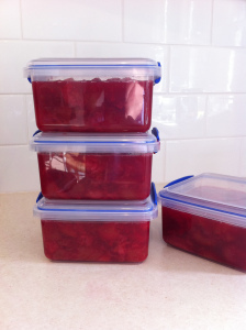 I did my best to fill her order, with hubby helping to wash and stone and cut (and snack!). But in spite of our best efforts, work and writing and everything else got in the way and I didn't quite manage a year's supply this time. Preserving fruit is hot, hard, time-consuming work! However there is a still a satisfying number of containers stored away in pantry and freezer. And, yes, I confess, I'm guilty of holding open the cupboard doors and gloating over them!