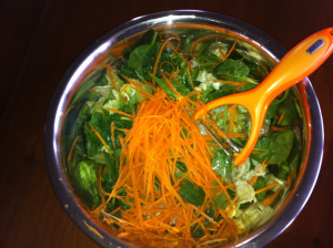 My latest acquisition is this gadget for julienning vegetables. Just slide down the carrot and you have fine, even slices.