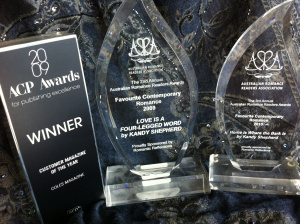 In the middle is my award for Favourite Contemporary Romance awarded by the Australian Romance Readers Association for Love is a Four-Legged Word. I was amazed and delighted to win—the winner announcement was one of the most thrilling moments of my life. The award on the right is for the same category in last year's awards for Home Is Where the Bark Is. I really couldn't believe that I'd won two years in a row. The winning of these awards is all the sweeter for the fact that my Berkley Sensation novels are not readily available in Australia.