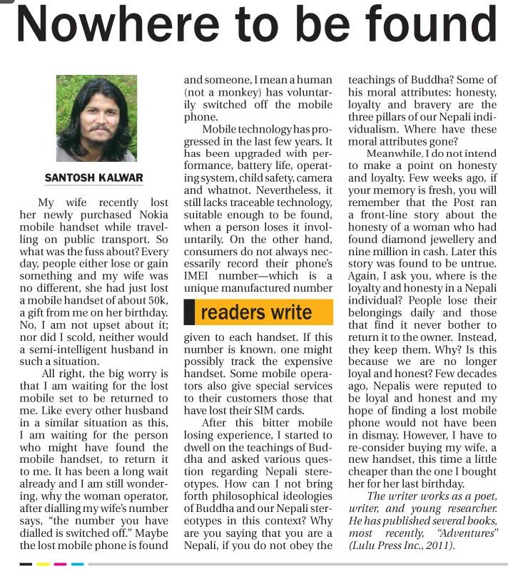 Some mobile operators also give special services to their customer when they lose their SIM card. After this bitter mobile losing experience, I found that one could visit the mobile service operator's office and ask for the same SIM card. How can I not bring forth philosophical ideologies of Buddha and our Nepalese stereotype in this context? Why are you saying that you are a Nepalese, if you do not obey the teachings of Buddha? Some of his moral attributes: honesty, loyalty and bravery are three pillars of our Nepalese individualism.