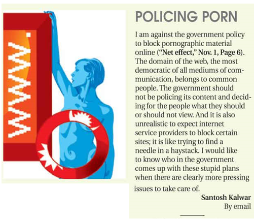 I am against the government policy to block pornographic material online ("Net effect," Nov. 1, Page 6). The domain of the web, the most democratic of all mediums of communication, belongs to common people. The government should not be policing its content and deciding for the people what they should or should not view.