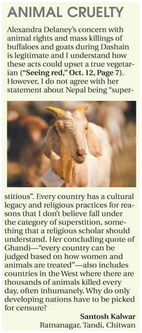Alexandra Delaney's concern with animal rights and mass killings of buffaloes and goats during Dashain is legitimate and I understand how these acts could upset a true vegetarian ("Seeing red," Oct. 12, Page 7). However, I do not agree with her statement about Nepal being "superstitious".