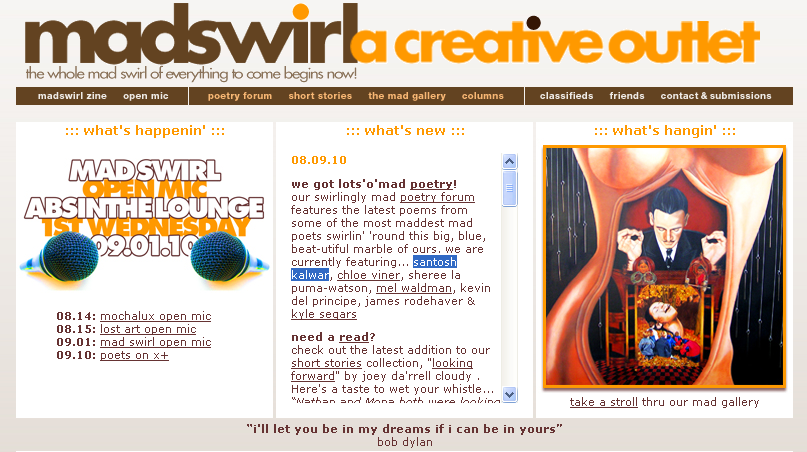 Good news !!! One poem accepted/featured in MAD SWIRL poetry journal entitled, "creation"..... You may read the poem here for free: http://www.madswirl.com/content/poetryforum.html Here is the picture in which they say about featuring my work and other artist works....