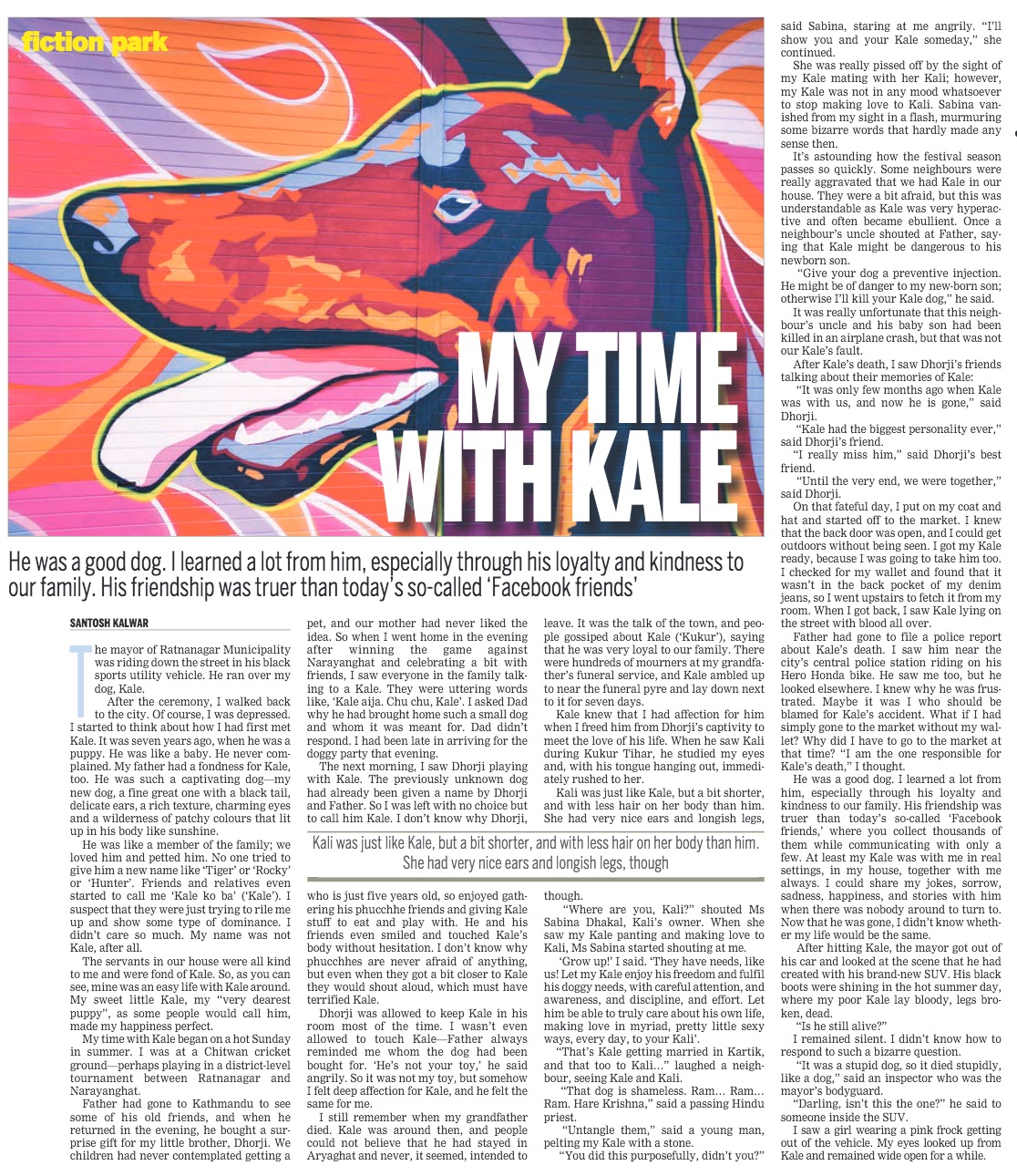 I want to inform you that I feel a bit hesitant to respond to your proposal to come back to Nepal and start a new life there. I would have tried to find my way to you if it were not for Ms Molly. I love you, but you know how I love her more. I don’t know whether this comes as a surprise to you or not, but I am already married to Ms Molly now. We have been together for the last 27 years.I still remember the day when Father brought Ms Molly home. I was one. She didn’t have a lot to say as she used combinations of the utterance ‘Meow’; but that was more than enough for us to communicate. You may wonder if she is able to fulfill my desires, but I want to tell you that she has grown big. She is five-feet-six-inches-tall now. She is less a cat and more a human now. She protects me. She is there when I need her the most.You also write that you want to raise a family with me. It would be one of the nicest things to give birth to your babies. But yesterday, I stayed up all night and thought about it. What is their use? What use are they when people in power will continually start a new world war every few year or so? What use are they when every day a new calamity strikes the earth, killing millions? What have we done to this world?Enclosed with this letter are 450 manuscript pages written by my father. It is a walkthrough on the process of subduing the effects of an earthquake when it strikes. In our part of the earth, we have implemented this scientific process, and I hope you can use these pages to stop earthquakes from happening in your part of the earth too. I cannot wait to read your reply.xKristaPS: Please do send me your brain-computer transmission of words more securely.Sent from: sessiK dna sguHPosted on: 2015-07-05 08:42Published: The Kathmandu Post (under different name in print)