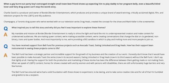 You have received support from Bell Fund for previous projects such as Avocado Toast, Dating Unlocked and Drag Heals. What has it been like working with the Bell Fund in developing your projects, and how has their support been instrumental in seeing these projects come to life?The Bell Fund has been a strategic partner and incredible support for the growth of my business and the creation of our work. I honestly don’t know that it would have been possible to make Avocado Toast the series (now in its second season), Dating Unlocked or Drag Heals (now in its third season) without the Bell Fund. I don’t say that lightly at all. Having the support for both the production and marketing of these stories has been the difference between them getting made or not making them.