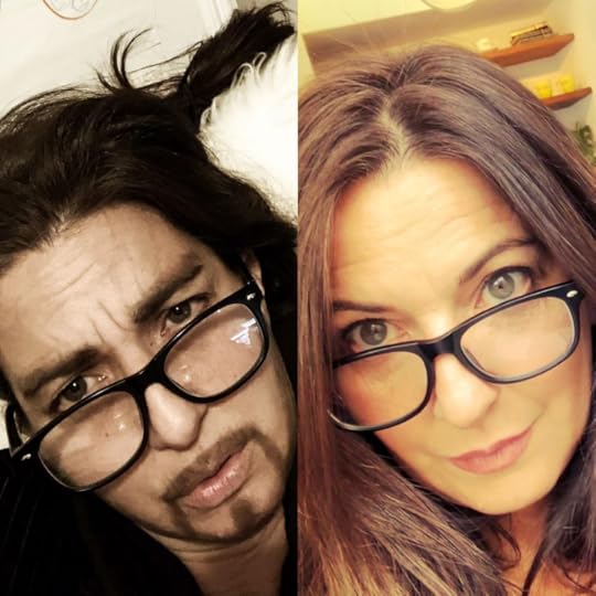 Buddy is my male drag persona. He has long dark hair, wears a navy bandana, a Canadian tuxedo (jeans and a jean jacket) and a handle bar moustache with a goatee.