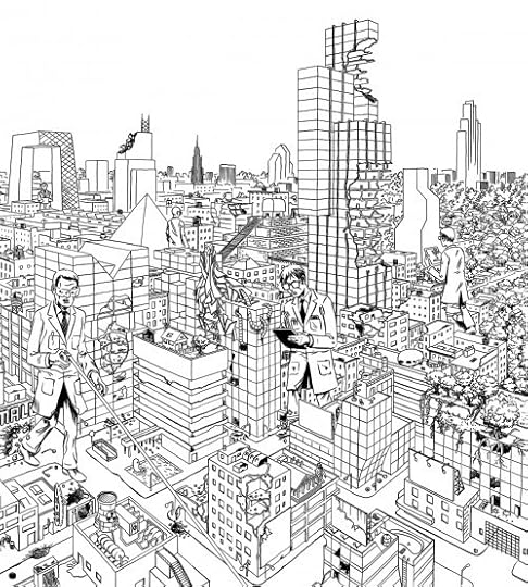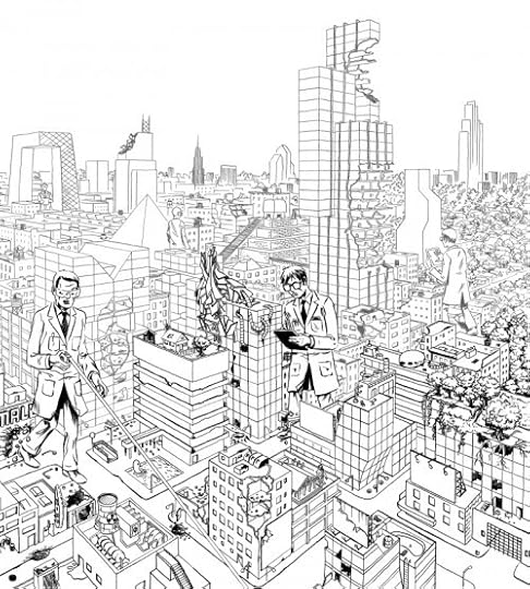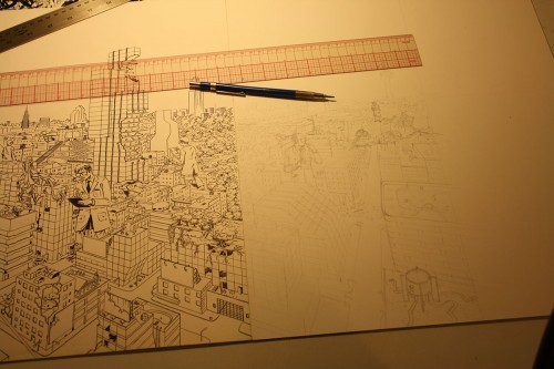 It took me a while to work up the nerve to ink this thing. Normally I would’ve inked most of the building with rules & rapidographs. But I decided against it… Since everything was so rigidly planned out, I wanted to have a more organic line in the finishing process. Click on the image to super-size.