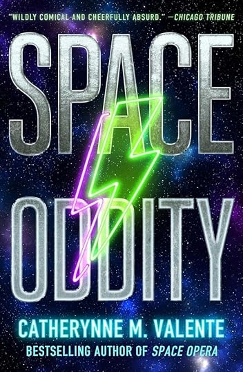 The cover of Space Oddity by Catherynne M. Valente. A David-Bowie style lightning bolt is on a starry background behind the title of the book.I received this as an ARC via NetGalley.