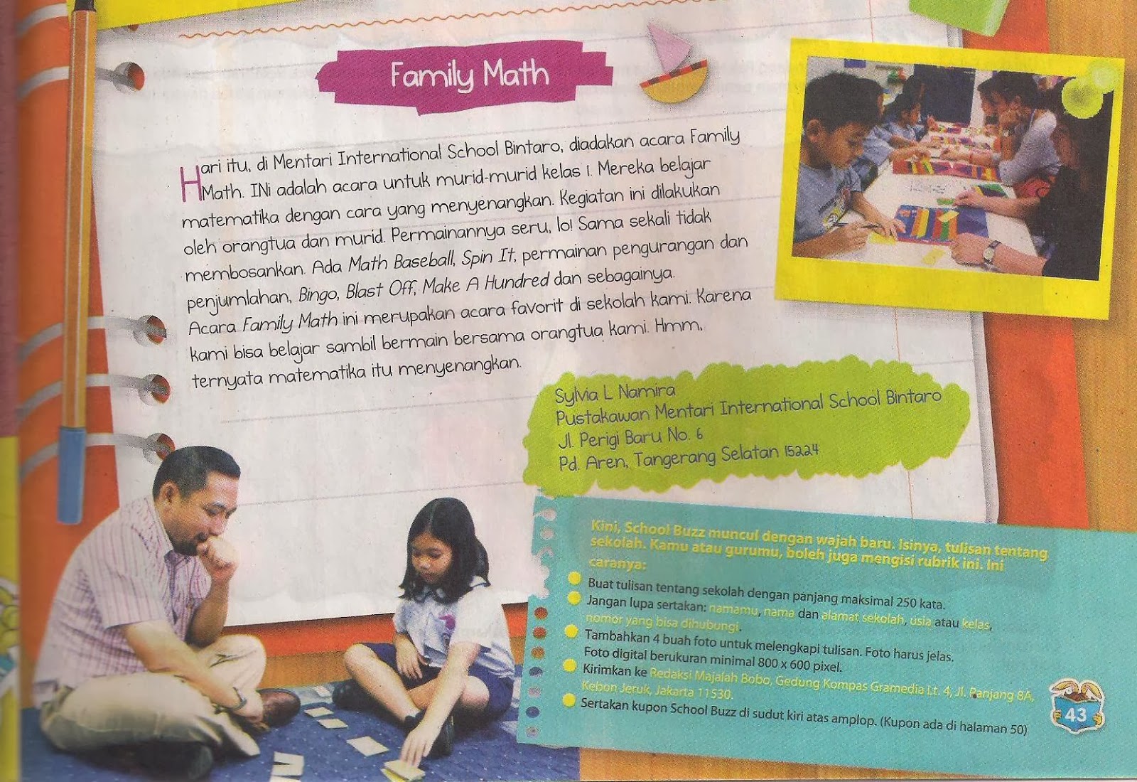 Family Math di MISBMelihat tulisan saya mejeng di majalah Bobo, saya jadi terpacu lagi buat menulis kembali. Saya sadar, memang harus ada niat dan kedisiplinan dalam menulis. Persis seperti kita dalam menjalani hidup, harus disiplin. So, jelang NanoWrimo di bulan November nanti nih, saya akan mulai membuat plot cerita. Who knows, di tahun 2014 ada novel saya yang terbit. Syukur-syukur terbit 2, sebagai pelipur lara tahun ini yang tidak menelurkan karya apapun.
