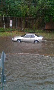 According to my cousin, the water had receded a foot before she took this picture. That was after she helped rescue someone else from their car and then helped a third stranger push his car three blocks to safety. In heels.