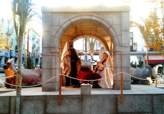 Veréis que os traigo el "establo" donde se albergaron José y María y nació el niño Jesús. Es el portal del enorme nacimiento que montan todos los años en las calles principales de San Lorenzo de El Escorial con figuras a tamaño natural. Además del portal y sus protagonistas (incluidos la mula y el buey, por supuesto), están los reyes magos, ángeles, pastores, cortesanos y soldados romanos, molineros, mercaderes, panaderos, y todo un pueblo de Belén con casas de atrezo y muchos personajes y animales, tanto los habituales como caballos, burritos, ovejas, cabras, vacas, gallos, gatos, perros -y también buitres- hasta los traídos de otras tierras, como jirafas, dromedarios, camellos, pájaros exóticos, etc. Este año incluso tenemos un gorila, nada menos. Y entre ellos y los habitantes de Belén nos mezclamos quienes lo visitamos.