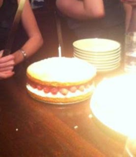 After the main course, we all sang happy birthday as the waitress brought in my cake with the candle sparkling on top. I was pleased that my friend said how lovely it looked. Then the other girl unveiled her cake, saying self-deprecatingly that it was terrible. It thudded down on the table with a splat, as a load of icing oozed out of the bottom. The whole table burst out laughing at the discrepancy between the two cakes.