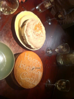 I then iced the top, having created a 'guide' first and pricked the letters onto the cake through a piece of baking parchment. I slid the cake carefully into a box, placed a candle and matches inside, and set off for the restaurant, feeling pleased with myself. Once there, I surreptitiously asked the staff if they could bring the cake in after the main course.