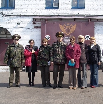 Judith Pallot with co-author Laura Piacentini, various correctional officers, and research collaborators outside the entrance to IK14. The Governor of the colony (Kulyagin) is in the centre of the photo.
