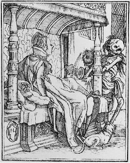the procession consisted of a series of couples, one living and one dead, arranged in an order of precedence beginning with pope and emperor and ending with a hermit and a baby. Underneath each dancer an eight-line octosyllabic stanza offered a moralistic commentary with a distinct social edge: death treats all estates equally.