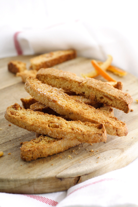 Image credit: biscotti with candied orange and pine nuts arranged on a round chopping board. Photo by LuluDurand, iStockphoto.