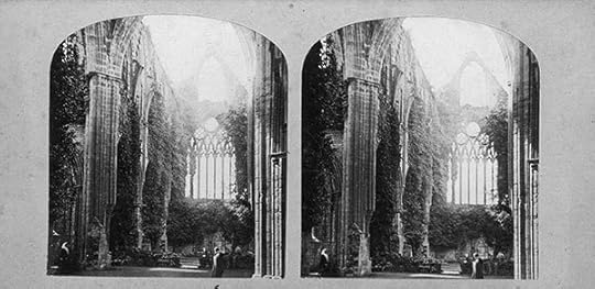 One of the most popular British stereoscopic destinations was Tintern Abbey, the ruined stony arches of rural Wales. William Wordsworth’s poem about the area had made the abbey into the foremost destination for adventurous travelers with Romantic sensibilities. Now stereoscope owners could use the device to travel virtually to the Gothic abbey, letting their eyes wander along ruined walls traced with ivy, or looking up at massive arches open to the sky. Although the stereoscope epitomized modern technology, with its lenses, optics, and photographic cards, the kinds of images that viewers consumed inside the stereoscope tended to look back into a romanticized history. (The images gave no indication, meanwhile, of the roaring iron factory near Tintern Abbey that disturbed visiting tourists). These details remind us that technology itself is not inherently oriented toward the future; in fact, new media often intermingle with old media, as new technologies enable nostalgic, fantastical journeys into the past.