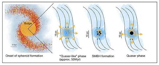 The astrophysicists computer-coded the above and calculated what happens when an elliptical galaxy begins to form when, roughly two hundred million years after the Big Bang, the gas in the cosmos had sufficiently cooled through its expansion to gravitationally collapse. The first-formed extremely massive star clusters were full of heavy stars, leaving many millions of normal black holes in regions spanning not much more than 10 light years across. This was over after about 10 to 20 million years when the last massive star died. But around these first clusters of black holes, the elliptical galaxies were just starting to form. The formation of a whole galaxy continued for about a billion years and, during this extremely violent time, very large amounts of gas fell onto the cluster of black holes near its centre. The gas squeezed the cluster together until the black hole velocities within the cluster became relativistic. At this point, the cluster of black holes started radiating a critical amount of its energy as gravitational waves. It consequently collapsed within a dozen million years to a combined black hole mass of a hundred thousand to millions of Suns. As the elliptical galaxy continued to form around this massive black hole, gas kept falling onto it so that it grew more in mass as a quasar, with additional massive elliptical galaxies hosting more massive central black holes that grew faster.