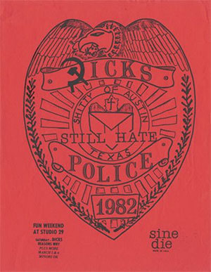 Reagan-era punks in the US also played the game of détournement, especially in homemade flyers advertising local shows. A 1982 flyer for the Dicks, a self-proclaimed “commie faggot band” from Austin TX, hijacked the police badge, turning a symbol of oppressive state authority into a punk logo and queer fetish.