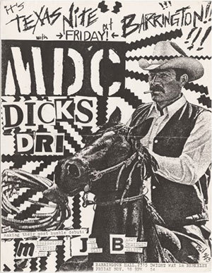 This flyer also brings to mind a song by the headliner MDC entitled “John Wayne was a Nazi” (1982) with lyrics that flip the script on another media cowboy and beloved American icon: “late show Indian or Mexican dies, Klan propaganda legitimized… When I see John, I’m ashamed to be white.” The song indicts the United States for its own history of white supremacy and glorified genocide using a clever double détournement of punk’s Nazi imagery. The ambiguous hard-edged irony of 1970s punk gave way in the 1980s to direct political language and a new activist consciousness.