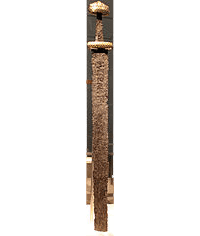From Old Germanic three words for “sword” have come down to us. Two of them occurred in the fourth-century (CE) translation of the New Testament into Gothic. The verses with the word for “sword” are L 2. 35 and E 6. 17. In the King James Bible, they sound so: “(Ye, a sword shall pierce through thy own soul, also)” and: “…take the helmet of salvation and the sword to the Spirit, which is the word of God.” The Greek text has mákhaira and rhomphaía. Bishop Wulfila, who either translated the entire text or at least edited it, used hairus (pronounced as herrus) and meki (with ē, long e). The Greek for sword, memorable from Homer and Hesiod, is ‘áor, but, for some reason, it did not satisfy Wulfila.