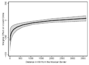 When a state at the Mexican border legalizes marijuana for medical consumption, the violent crime rate decreases by 13 percent on average. Whenever inland states introduce such laws, violent crime in the nearest border state decreases, as smuggling routes leading to the state become less profitable. The strongest reduction of crime is in counties closest to the Mexican border, with 200 less violent crimes per year as is illustrated in the figure. The figure shows that the negative effect on crime diminishes as a county is located farther away from the Mexican border. The crimes most strongly affected are robberies and homicides. Murders related to the drug trade decrease by a staggering 41 percent.