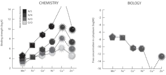 To reach this conclusion, Williams started with the series that carries his name. He observed that cells are constrained to follow the Irving-Williams series when they pump metal ions in and out to maintain particular metal concentrations inside the cytoplasm. Concentrations of sticky ions like copper must be kept low lest they stick to the wrong thing, while less sticky ions like manganese can be kept at higher concentrations. This results in a graph of cytoplasmic transition metal concentrations being the exact inverse of the Irving-Williams series: when binding is tight, concentrations are low, and vice versa (see the graph on the right). This general rule applies to life at all places – and at all times.