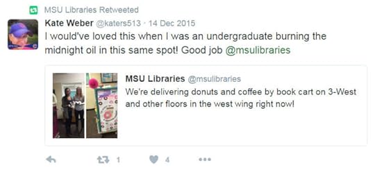 For this event, the librarians snap photos and put them on their three social media channels – Facebook, Twitter and Instagram – and the posts quickly become their most popular social media posts of the year. The program is offered to all students – around 50,000 individuals – every finals week (twice a year), thanks to a generous donation from Michigan State University Federal Credit Union.